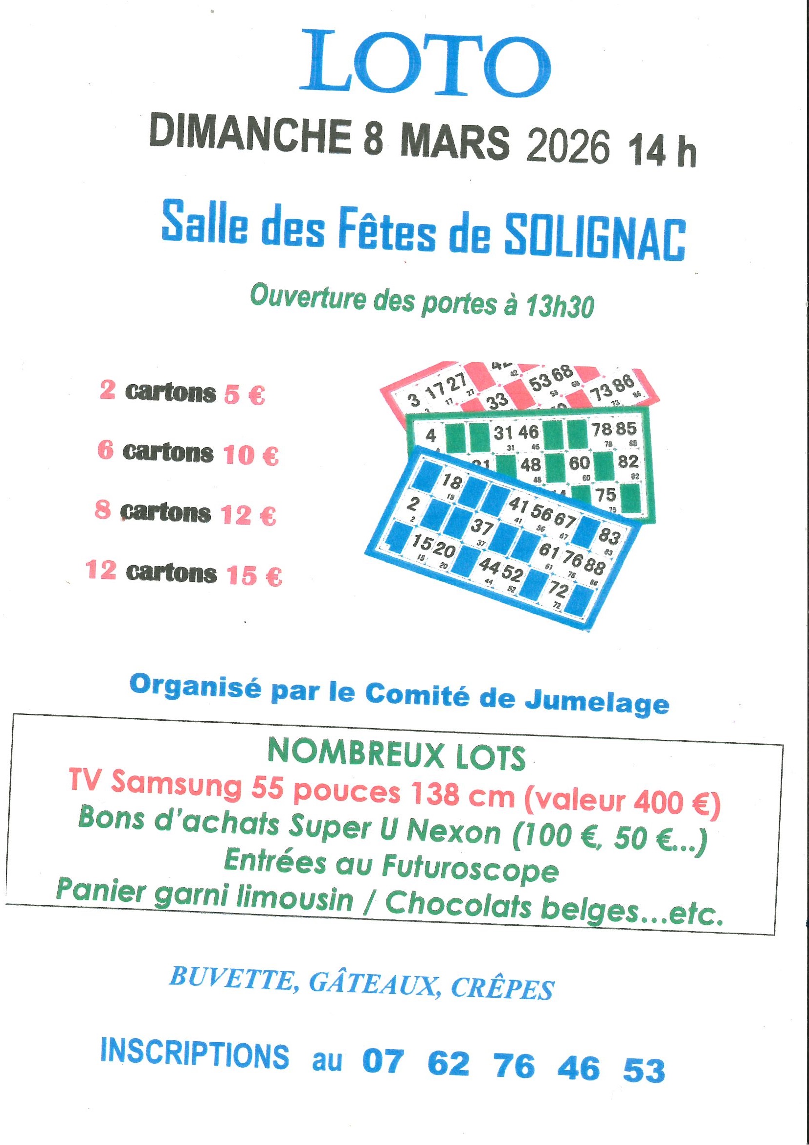 Le comité de jumelage organise un loto à la salle des fêtes de Solignac le dimanche 8 mars à patir de 14h00.